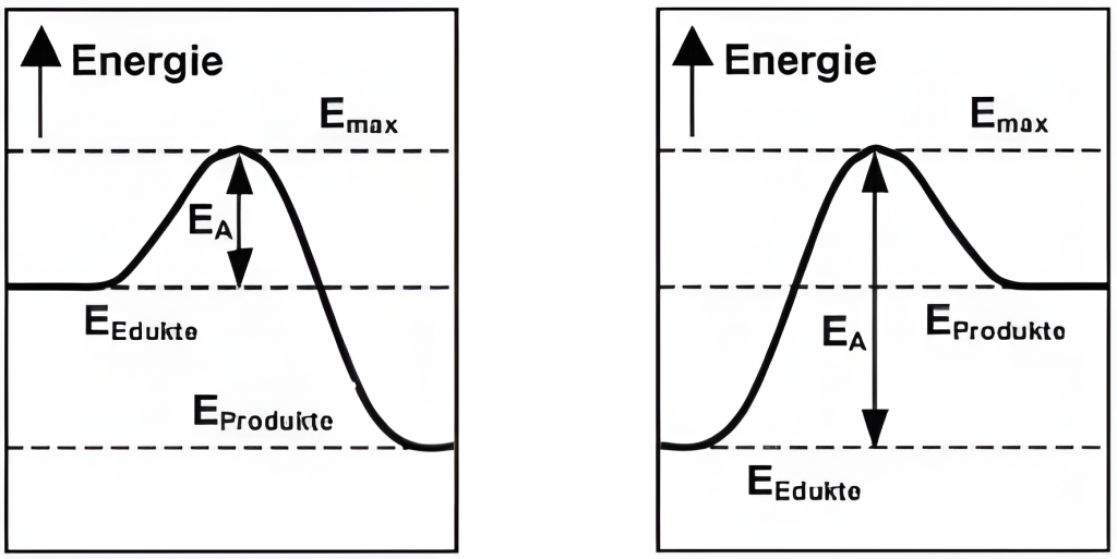 Energiediagramm mit zwei Darstellungen (exotherme und endotherme Reaktion). Zeigt die Aktivierungsenergie EA, die Energie der Edukte (EEdukte), die Energie der Produkte (EProdukte) und das Energiemaximum (Emax).
